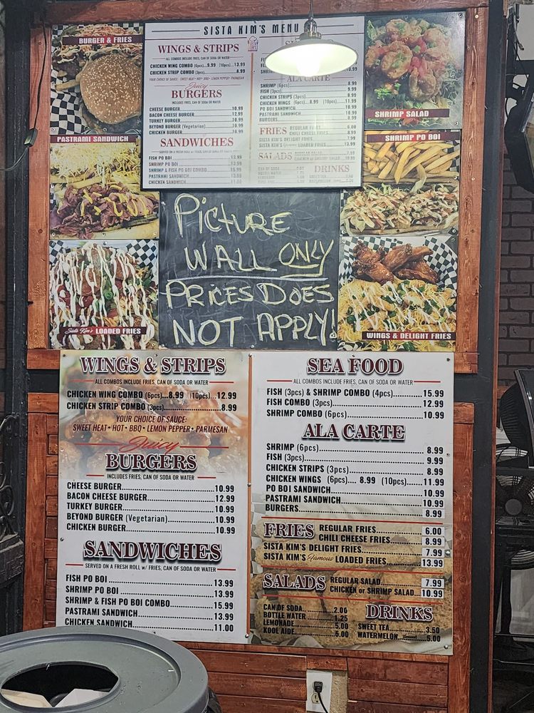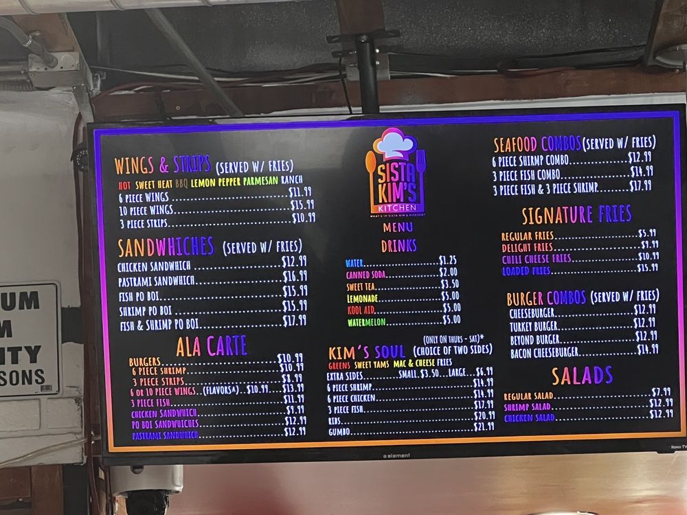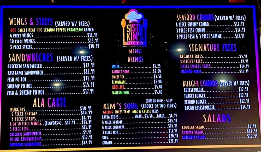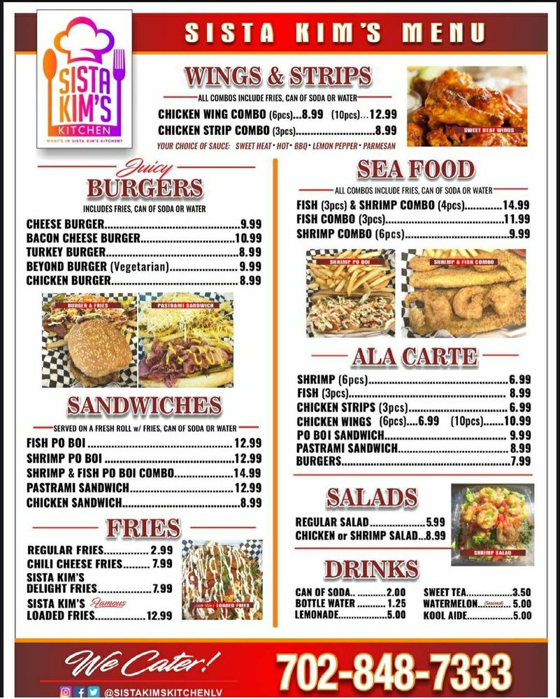 Sista Kim's Kitchen, located in Las Vegas, offers a diverse menu with options like salads, wings, burgers, and sandwiches. The restaurant provides delivery, takeout, and even reservations, making it convenient for any dining preference. With a focus on vegetarian options and sustainable practices like compostable containers, Sista Kim's caters to a variety of dietary needs and environmentally conscious customers. Customers praise the flavorful dishes, such as the shrimp and fish combos, burgers, and wings, highlighting the juicy and well-seasoned meats. The friendly customer service and welcoming atmosphere add to the overall dining experience, making Sista Kim's a must-visit spot for delicious comfort food in Las Vegas.